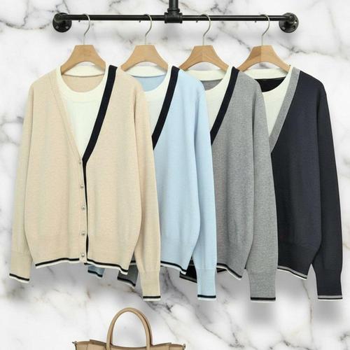 |CDJ6D65|여성 여유핏 레이온 혼합 배색 V넥 니트 가디건