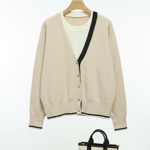 |CDJ6D65|여성 브이넥 배색 레이온 혼합 가디건 여유핏