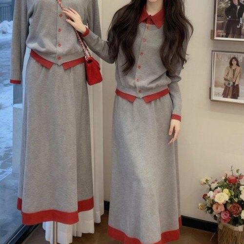 [페리엠]그레이 레드 배색 카라 니트 롱스커트 쉐쿠리투피스
