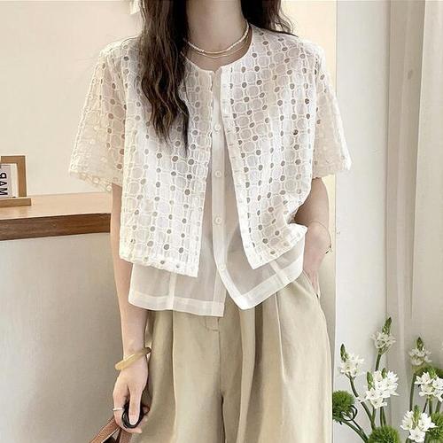 [다잇템][다잇템] 여성 남방 레이스 격자 여유핏 큰주머니 남방_23517442_588872