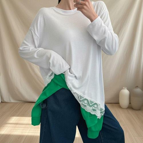 [옷자락]여자 사선 레이스 레이어드티 박시핏 긴팔 무지 티셔츠