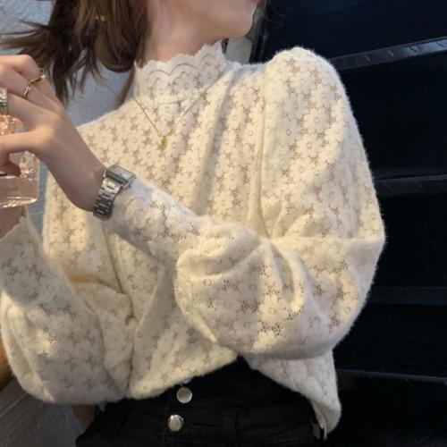 여성 스판 시스루 퍼핀 반목 레이스 블라우스 티셔츠 레이어드 이너티