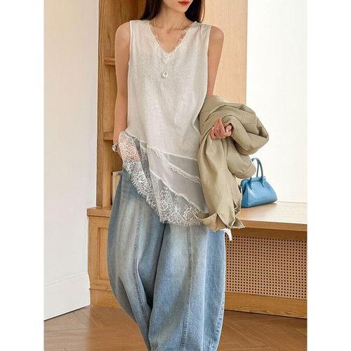 [하젤]아망 언발 레이스 롱면나시 티셔츠_M4706