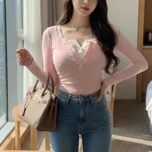 [다잇템]여성 레이스 V넥 롱슬리브 골지 슬림 단추 티