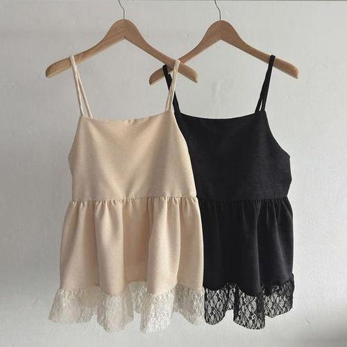 [옷자락]여성 레이스 셔링 포인트 민소매 티셔츠