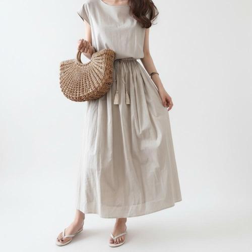 |CCO5998|여성 스트랩 허리 플레어 캡소매 중간 길이 원피스
