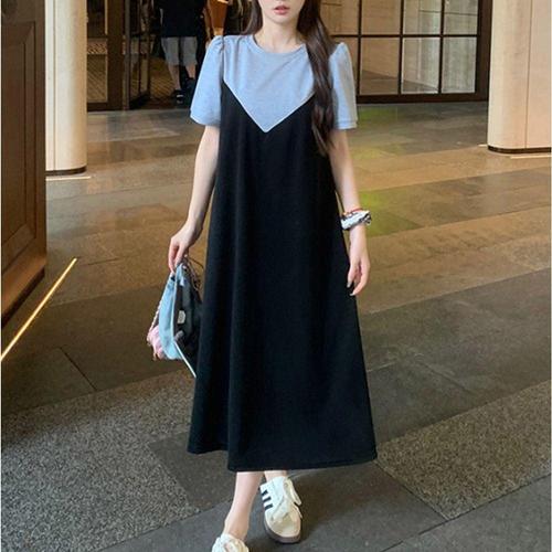[에이치플러스몰]루즈핏 편안한 레이어드 반팔 롱 원피스