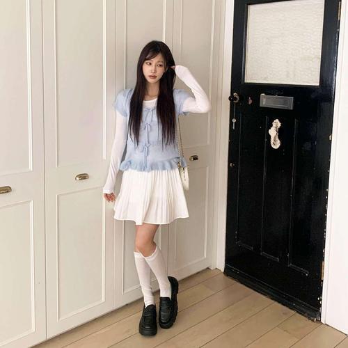 [시크블랙]크파민 리본 프릴 레이어드 반팔 니트