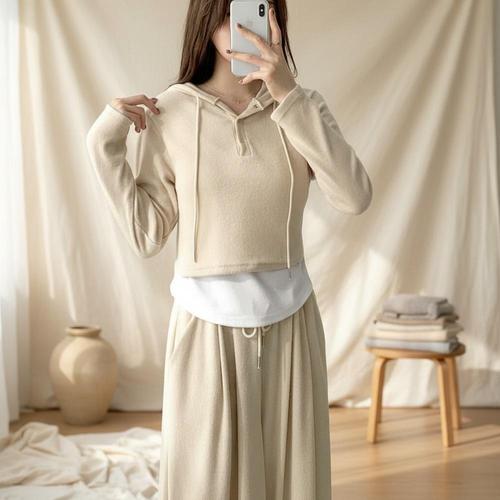 [옷자락] 여성 레이어드 버튼 크롭 후드티 와이드팬츠 세트