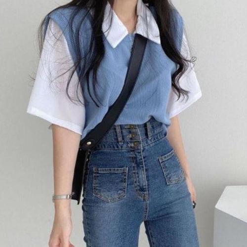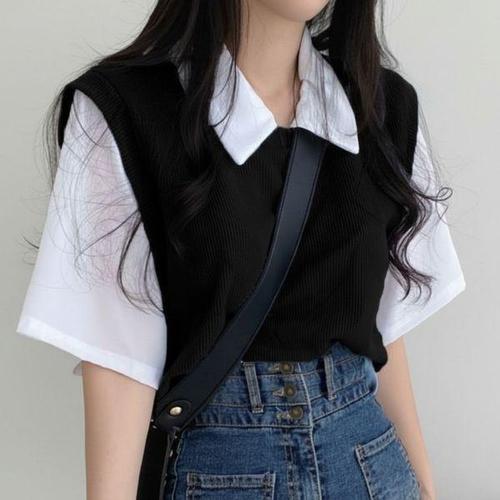 [신상오픈런]여성 봄 여름 니트 레이어드 반팔 조끼 셔츠