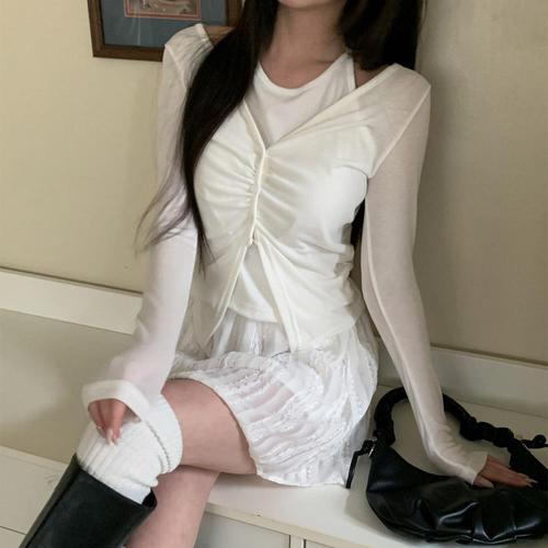 cammello 꾸안꾸 시스루 레이어드 슬림핏 셔링 티셔츠 여성 긴팔티