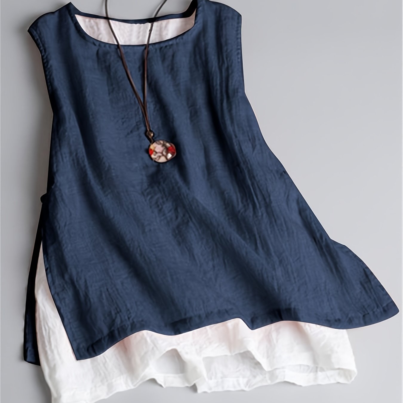 TEMU Directional YT: 라운드넥 페이크 투피스 컬러 블록 민소매 탱크 탑