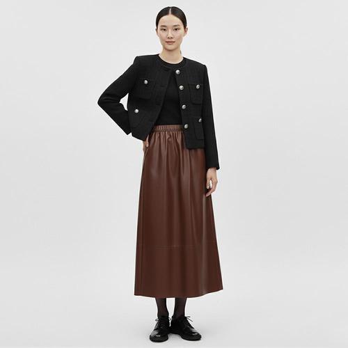 [샵앤][샵앤] 여성 허리밴딩 가죽 인조 레자 A라인 플레어 롱스커트 NTT-WSK-20813-브라운
