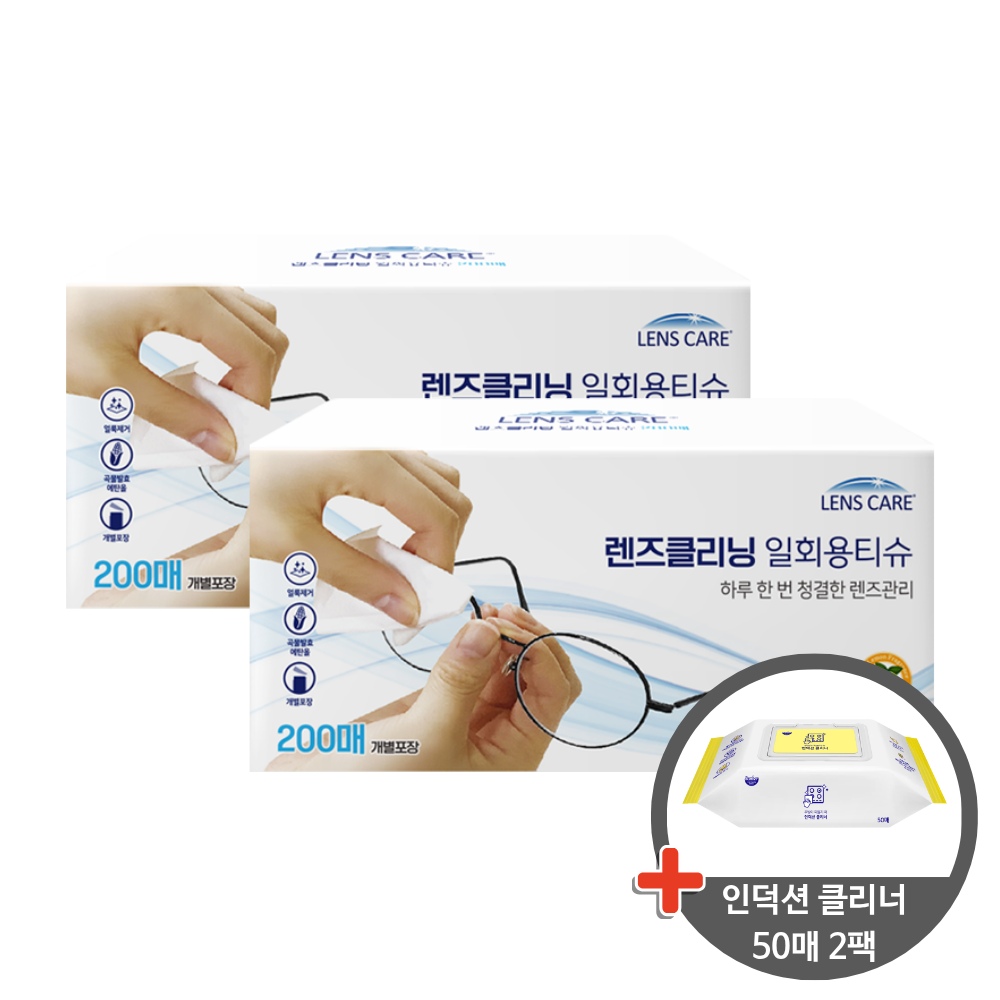 렌즈케어 렌즈클리너 일회용티슈 200매 2팩 안경닦이 모니터 핸드폰액정 카메라 다목적클리너