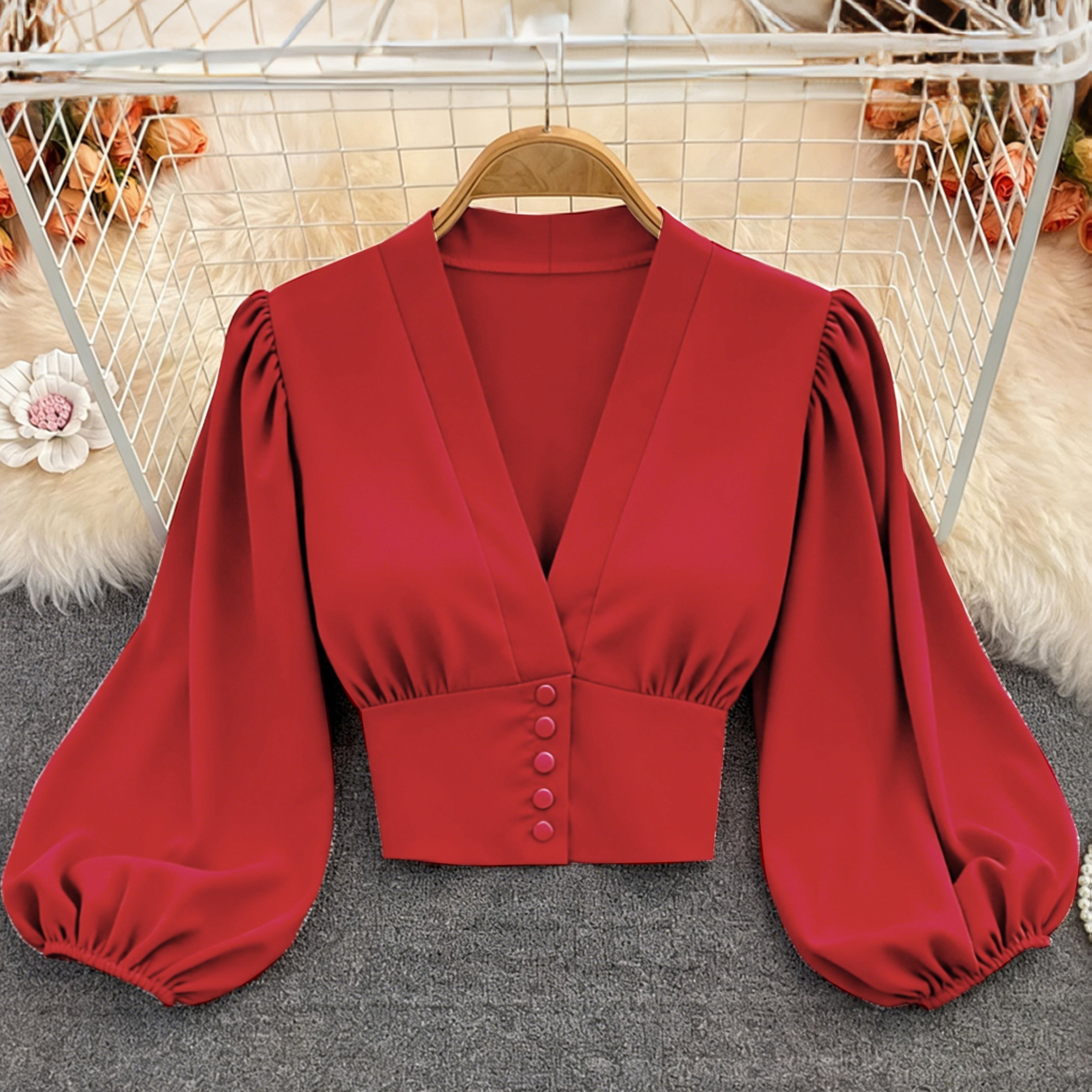 TEMU 레드 프렌치 스타일 V넥 여성 셔츠, 숏 코트 스타일 랜턴 슬리브 탑, 데일리 출퇴근을 위한 패셔너블한 밝은 빨간색 긴팔 티셔츠