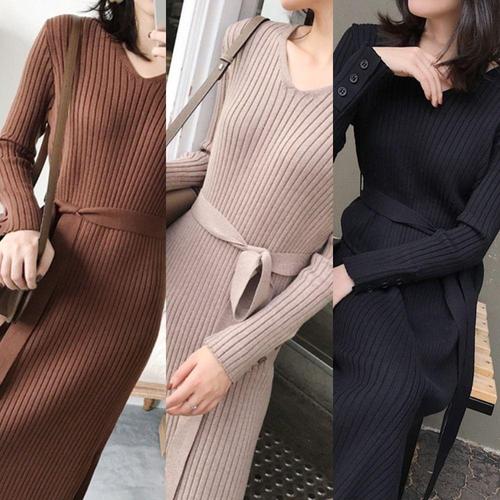브이넥 원피스 겨울 롱 롱치마 여성용 니트 슬림핏 WFMCKEE