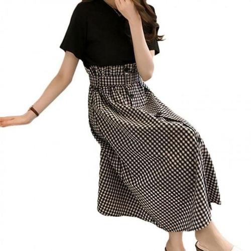 체크패턴 베스트 숏티와이드핏 롱스커트 여성용 투피스 WFJIVQ8
