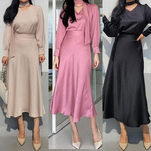 [바이어스]새틴 브이 타이 블라우스 플레어 롱 치마 투피스 세트 (12566791A)
