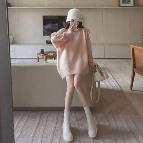 [에이치플러스몰]포근한 러블리 플레인 라운드넥 롱 니트티 숏 원피스