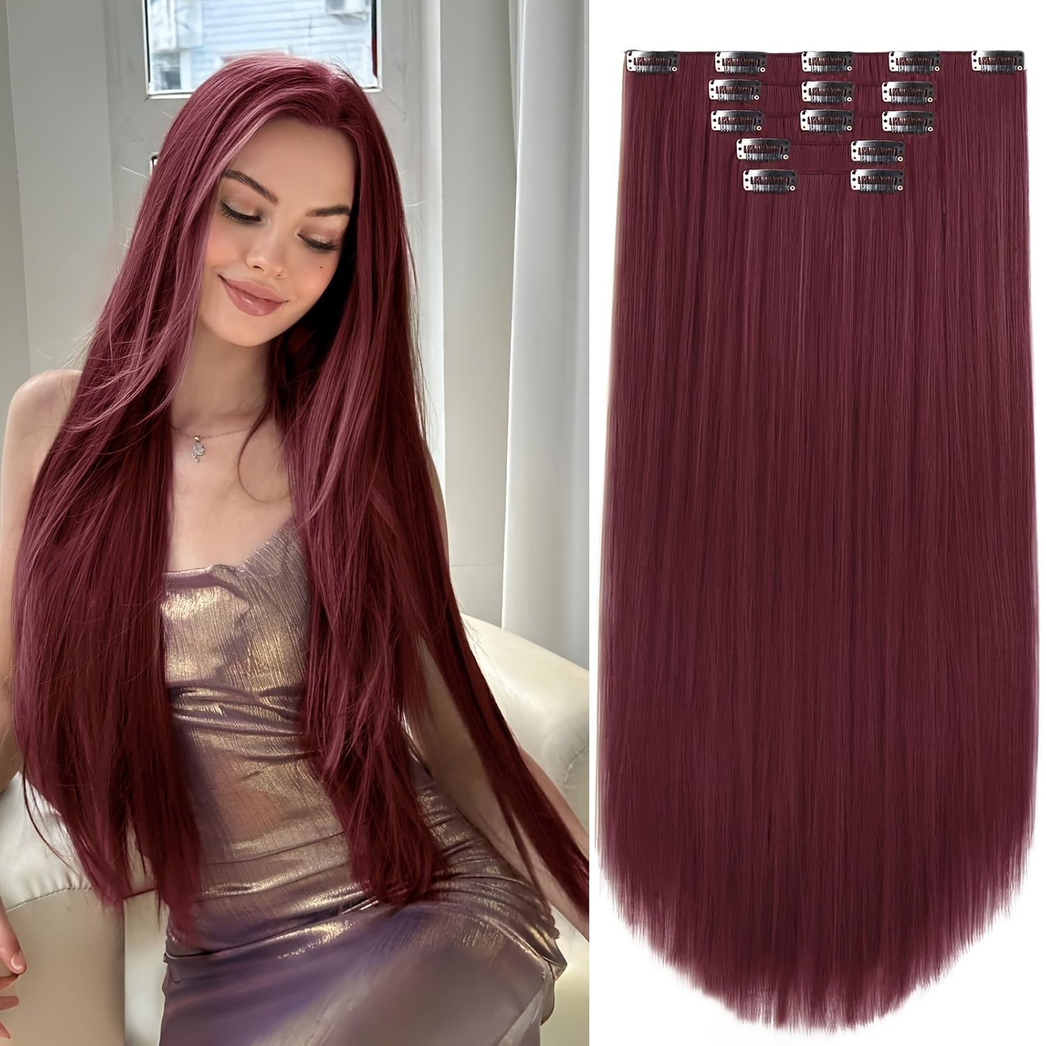 TEMU 버건디 클립인 익스텐션 22인치 긴 투명한 두꺼운 합성 가발 클립온 헤어피스 5개 부드럽고 엉킴 방지 여성용 웨딩 데일리 헤어피스