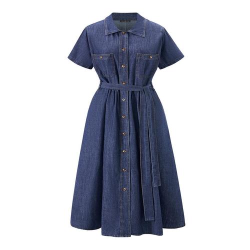 면 및 대마 플러스 사이즈 원피스 V넥 반팔 싱글 브레스티드, 우아한 루즈핏 접이식 캐주얼 원피스, 2024 여름 신상