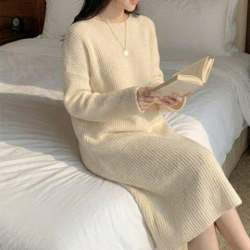 데일리앤 차르 부드러운 루즈핏 라운드넥 겨울 니트 미디 롱 원피스