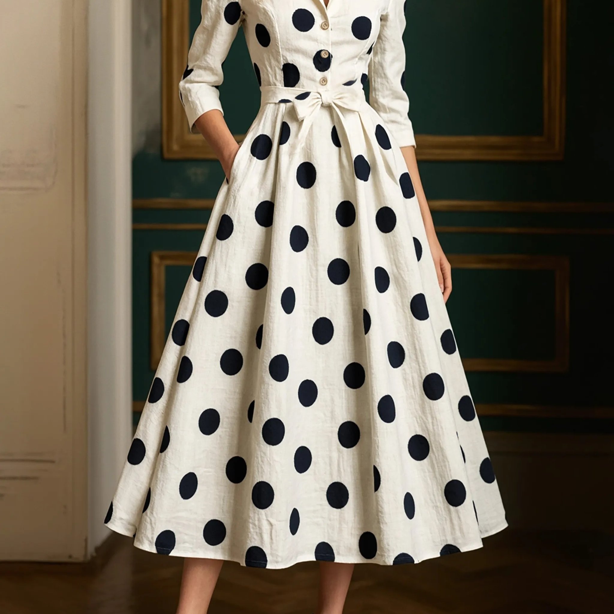 TEMU 2025년 신상 유럽/미국 여성 드레스, 패셔너블한 긴팔 화이트 물방울 무늬 드레스, 루즈핏과 넓은 밑단으로 캐주얼 출퇴근에 완벽.