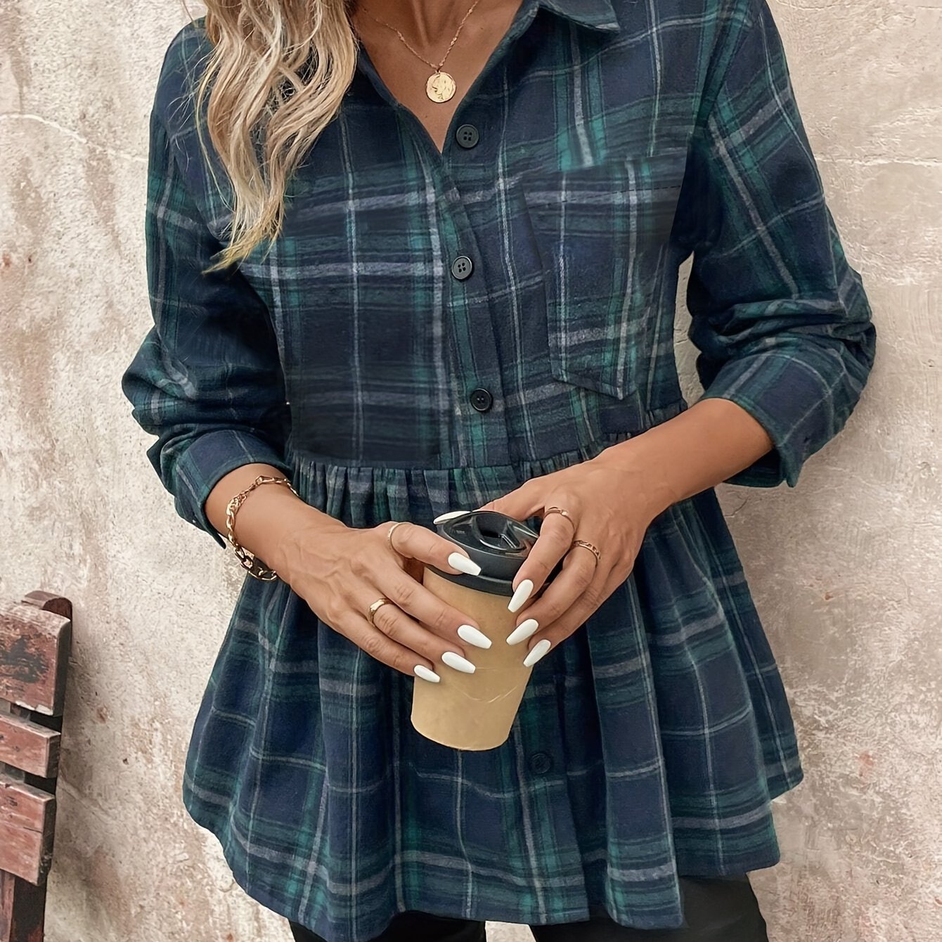 TEMU 체크무늬 버튼 프론트 셔츠, 캐주얼 롱 슬리브 라펠 칼라 셔츠, 봄 & 가을 여성 의류