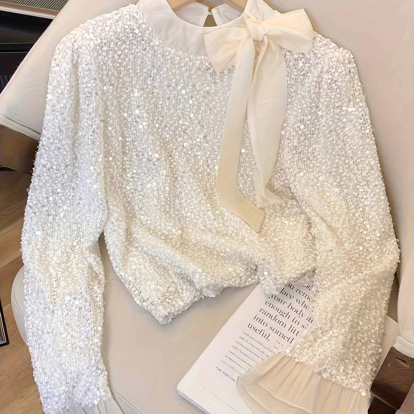 TEMU 레이디스 헤비듀티 시퀸 보우 셔츠, 신상 한국 스타일 시크 플레어 롱 슬리브 베이스 탑, 봄과 가을용