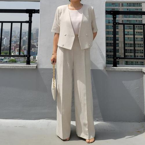 [셀러허브_여성트랜드패션]린넨 노카라 자켓 투피스 뒷밴딩 와이드핏 바지 세트