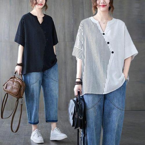 [에이치플러스몰]V넥 린넨 블라우스 빅사이즈 루즈핏. 여름티