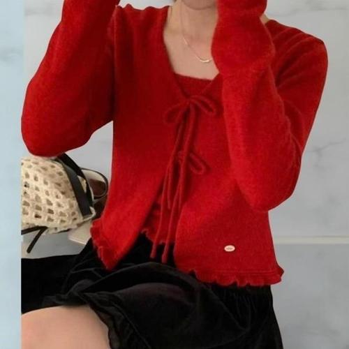 [다잇템]여성 울 스웨터 리본 귀여운 레이스 가디건