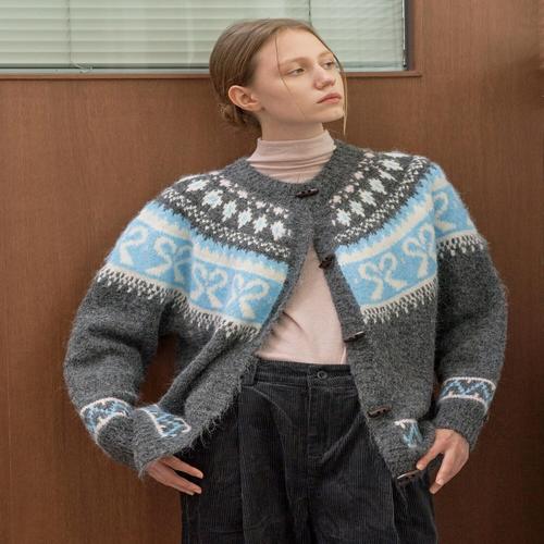 [나인식스뉴욕]리본 패턴 배색 더플 니트 울 가디건 (NP4CK018L0)