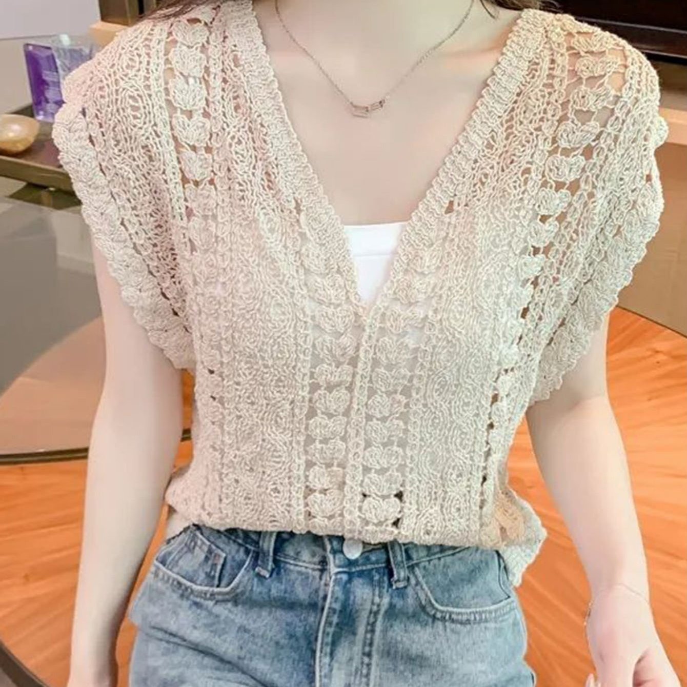 TEMU 여성용 여름 데일리 니트 나시 조끼 여성루즈핏 니트조끼 상의 브이넥 베스트 여름그물니트조끼
