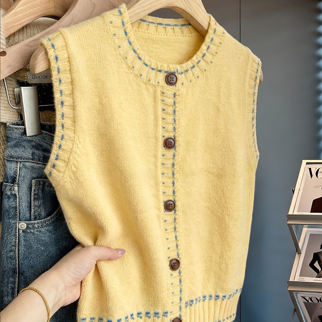 TEMU 여성용 기하학적 디자인 스웨터 조끼, 간편하고 스타일리시하며 버튼이 있는 원단 특징