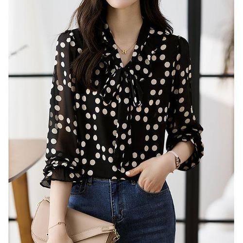 [위시드]페미닌 리본넥 도트 쉬폰 블라우스 (WIACBL047)