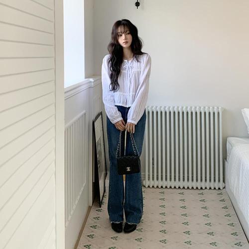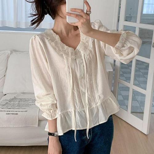 [셀러허브_여성트랜드패션]여자 봄 프릴 레이스 리본 프릴 퍼프 블라우스