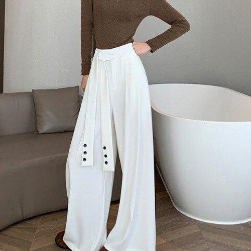 [신상오픈런]여성용 클래식 무지 컬러 핀턱 리본 디테일 모직 슬랙스