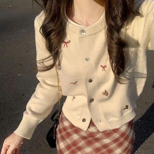 [다잇템][다잇템] 여성 리본자수 귀여운 카라없는 스웨터 폭신 가디건_22971505_588872
