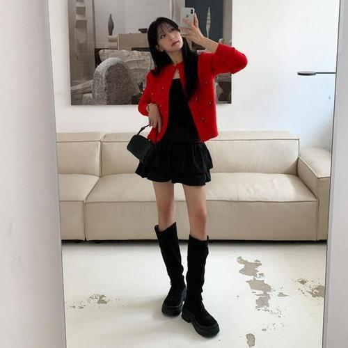 옷자락 / 여자 리본 스트링 자수 가을긴팔티 라운드 빨강 맨투