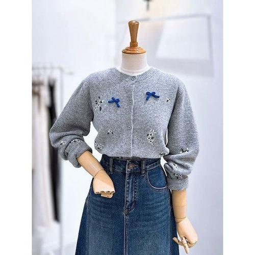 [옷자락]여성 러블리 리본자수 도톰 노카라 니트 가디건
