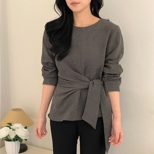 플러리싱 / 스웨이드 셔링 허리 리본 타이 블라우스 플러리싱