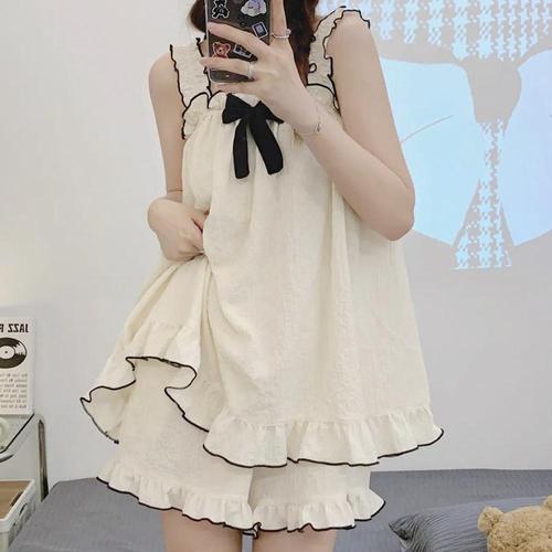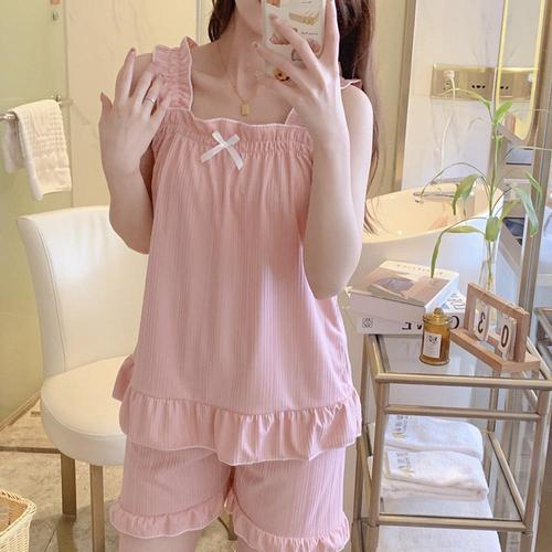 여름 여자 밴딩 리본 민소매 반바지 잠옷 세트 SDW-PTA-SURK292
