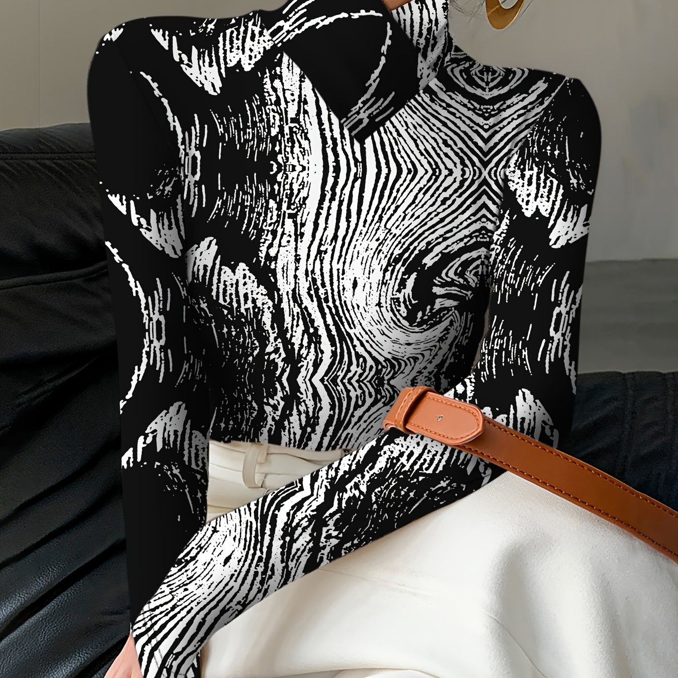 TEMU 여성용 우아한 하이넥 티셔츠 - 신축성 있는 메쉬 탑, 긴소매, 블랙 & 디자인, 올 시즌 캐주얼 & 포멀 웨어, 레이어링 또는 스탠다론 스타일로 활용 가능, 하이넥 티셔츠, 레이어링 피스, 세련된 스타일, 부드러운 질감