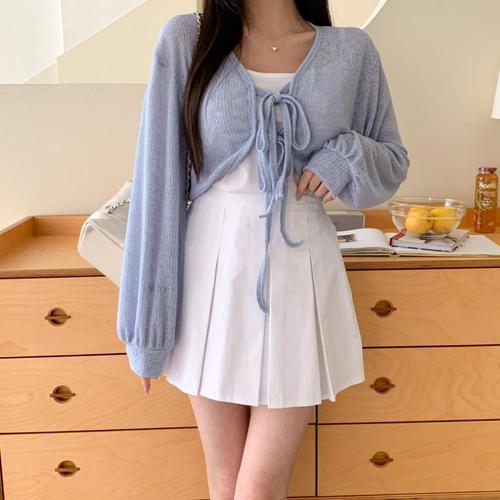 [옷자락]여성 여리핏 브이넥 가슴끈 골지 린넨 혼합 긴팔 가디건