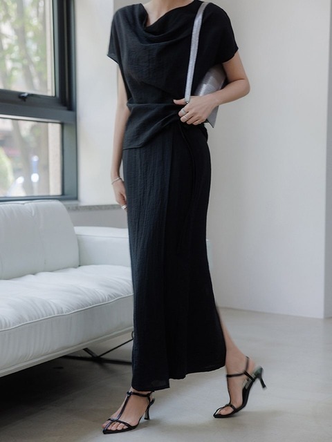 [메무아] 린넨블랜드 블라우스 랩스커트 셋업(블랙)