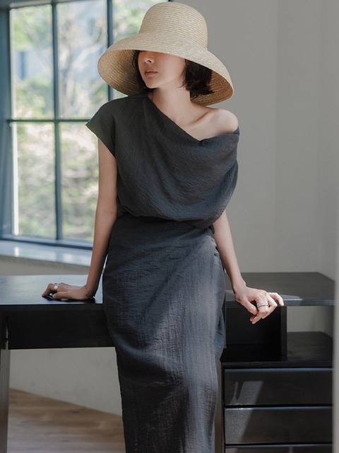 [메무아] 린넨블랜드 블라우스 랩스커트 셋업(차콜)