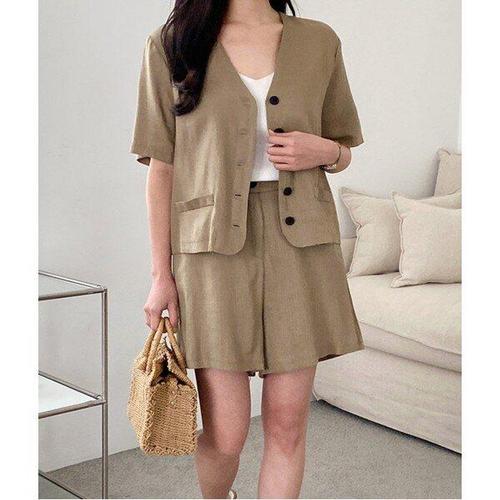 [위시드]심플 브이넥 린넨 단추 반팔 반바지 셋업 (WIBAOP047)