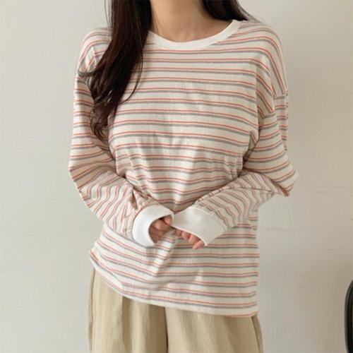 [옷자락] 여성 배색 링거넥 스트라이프 기모 기본핏 스판 티셔츠