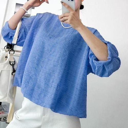[다잇템_패션]여자 벌룬 파랑색 벌룬핏 링클 칠부 블라우스